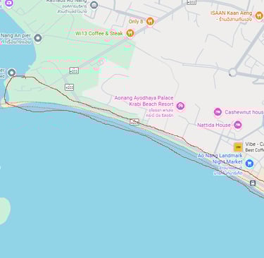 This is a beautiful walk that hides in plain sight. At the far quieter end of Ao Nang is a lovely stretch of coast: flat, scenic, and continually changing as you move from developed beachfront, to the boats on the pier, and the wild shoreline at the far end.
