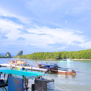 At the furthest point low creeping vines sweep across the sand, dotted with purple morning-glory flowers, it feels wild and peaceful, there are beautiful views of the limestone islands that sit close to shore. You have the option to stray toward the pier where longtail boats line up in colourful rows, resting on the sand between trips out to the islands. It’s a working shoreline, and there’s a gentle rhythm to it: boatmen chatting, engines humming, ropes being coiled. It’s hassle-free and part of the everyday life of Ao Nang’s community of Boatmen.